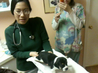 Today was an exciting day! Me and my babies went to visit the doctor for the first time. They took a close look to see if all my little sweeties are healthy. They also performed something they call “de-worming” whatever that means, but it seems really important to them. The doctor and the nurse were really nice and gentle handling my puppies, so it was all right with me. They also took their temperature, weighed them and listened to their tiny heartbeats. Lots of smiles are always on peoples faces when they meet my pups. That makes me really proud to be their mom! Look at all the pictures from the doctor’s office here in the Photos section.